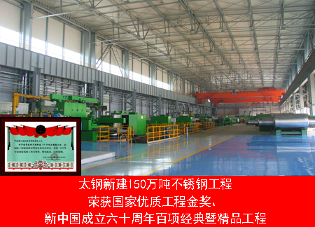 山西太鋼新建150萬(wàn)噸不銹鋼工程,是山西鋼鐵集團(tuán)有限公司“十五規(guī)劃”中的重點(diǎn)項(xiàng)目。獲得“國(guó)家優(yōu)質(zhì)工程金質(zhì)獎(jiǎng)”、“新中國(guó)成立六十周年百項(xiàng)經(jīng)典暨精品工程”、改革開(kāi)放三十五周年百項(xiàng)經(jīng)典暨精品工程。
